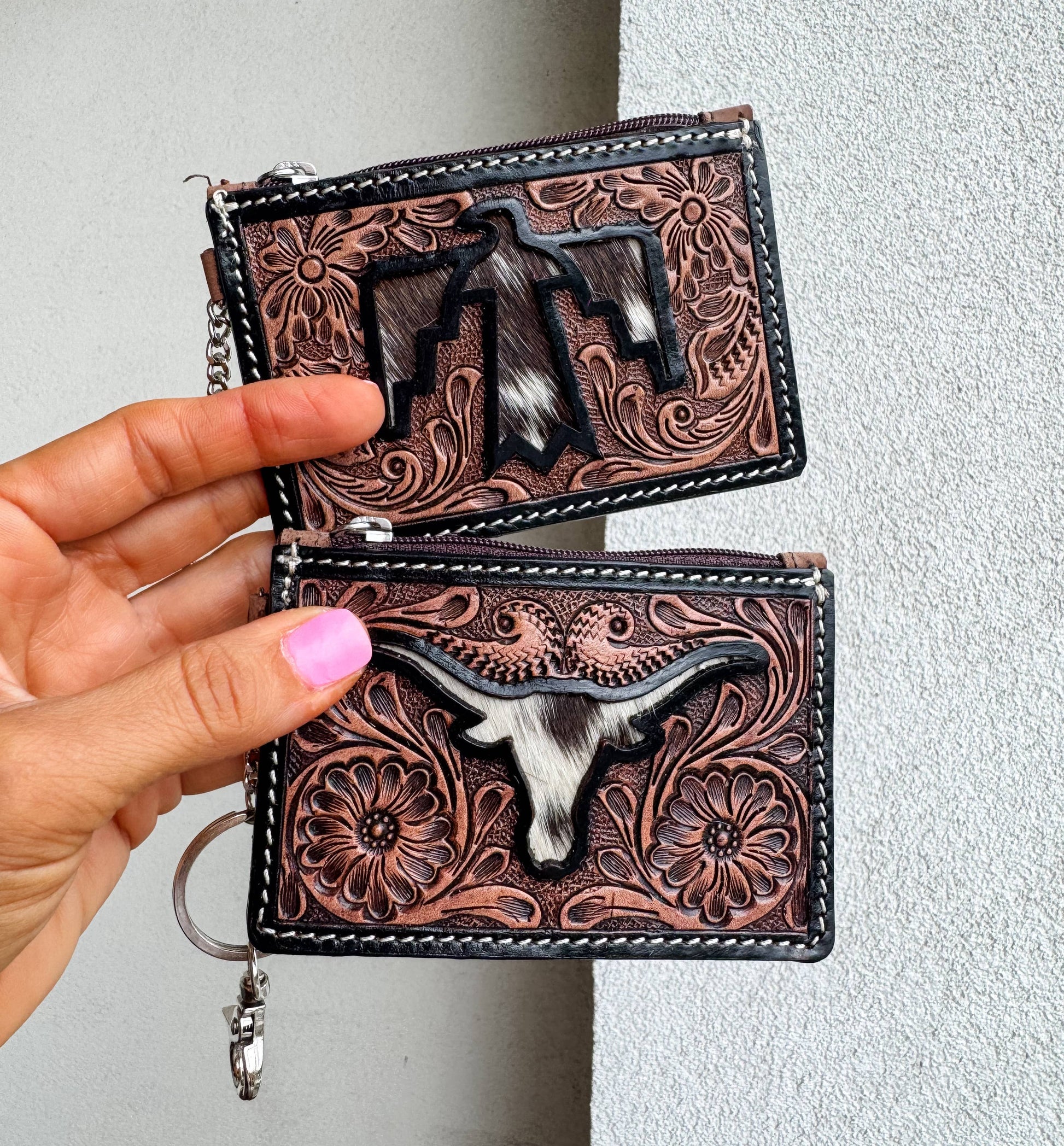 Keychain Wallet | Genuine Hair On Cowhide Keychain Credit Card Holder Change Coin Pouch | Credit Card Cash| Gift Idea | Gifts For Her Him How cute are these genuine hair-on cowhide keychain wallets! These make GREAT gifts! Perfect for credit cards, cash, coins. Clip this to your keychain. Throw this into a larger purse, a small handbag, diaper bag, or even your gym bag to keep organized! Front has hand tooled leather with turquoise outlined Longhorn | thunderbird/ freebird with cowhide in the center approximate size: 4.5” x 3.25” Zip closure pocket for cash/ change. Lined inside with fabric. 5 credit card slots Attached key ring/ keychain. Back is genuine tan leather stamped with our logo Please note that this is real cowhide and there can be small defects. XOXO