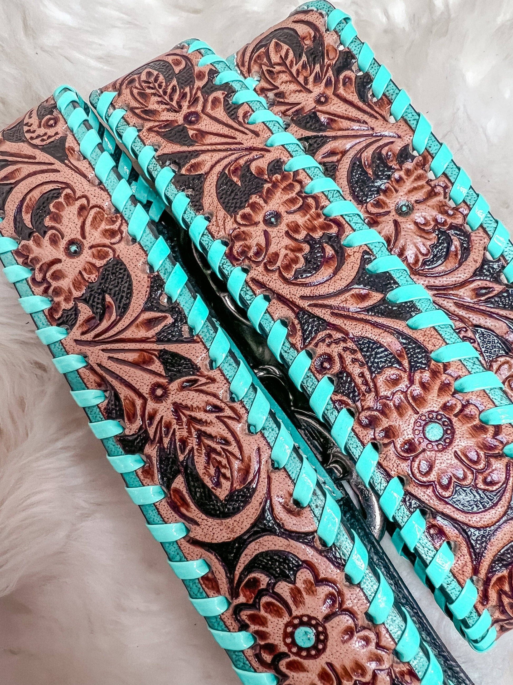 Turquoise Tooled Leather Western style Dog Collar, Show Dog, Farm Dog, Cow Dog, Cattle Dog