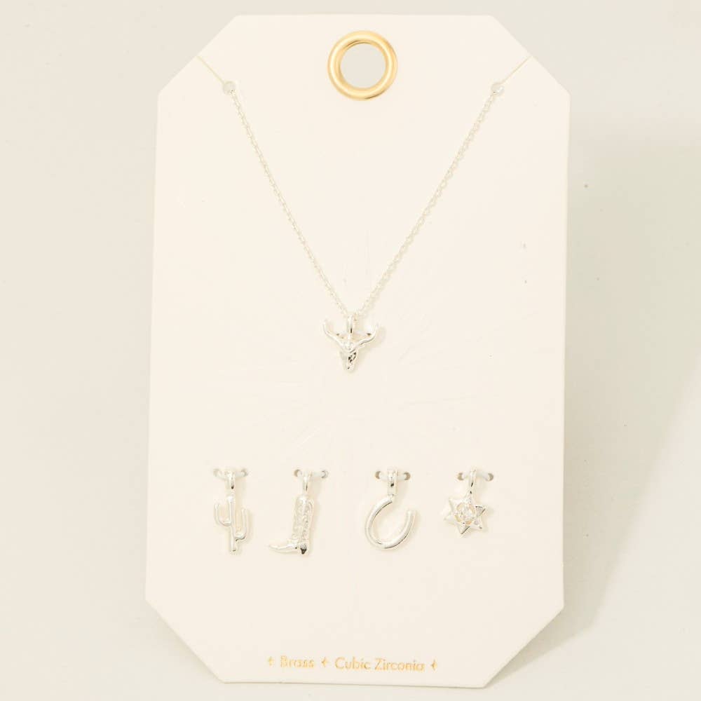 This necklace introduces a stunning western bull head swappable pendant style. Witness the perfect fusion of style and functionality as this necklace effortlessly complements your lifestyle. COMES WITH CACTUS, COWBOY BOOTS, HORSE SHOE AND STAR SWAPPABLE PENDANTS. 25%ZINC 50% BRASS 25% CZ